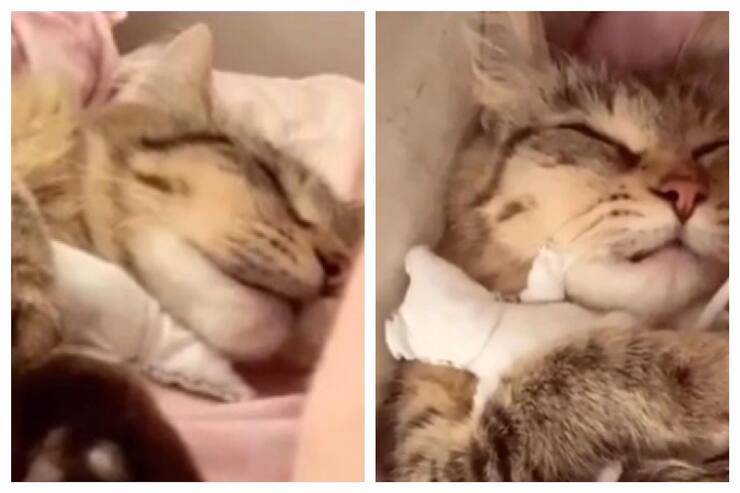La gatta perde il suo piccolo e cade in depressione. Trova conforto in un peluche cucito dalla sua mamma umana
