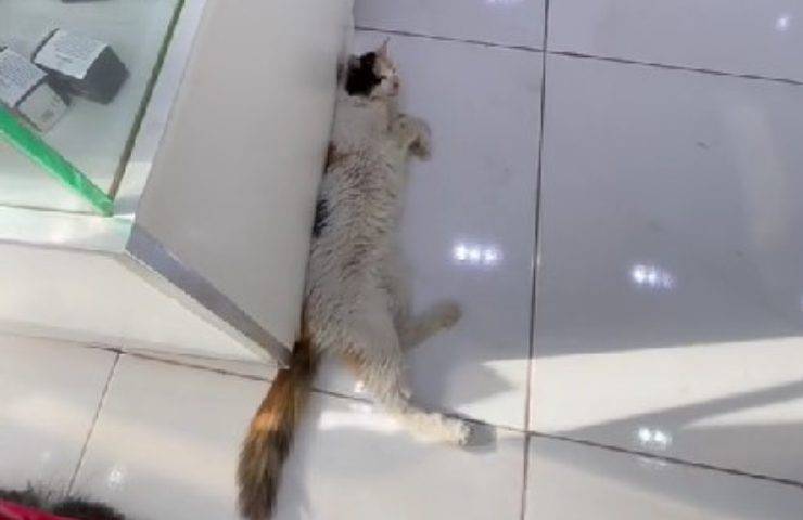 Fortunatamente, le suppliche del gatto non sono andate perse. Anche se avrebbe potuto respingerla, il buon uomo l’ha invece invitata ad entrare per rinfrescarsi. Con un bel “Benvenuta, benvenuta“, apre la porta del negozio per far entrare la micetta. “Vuole entrare. Ma dai… Benvenuta, benvenuta. Il sole è caldo oggi, vero? Benvenuta, benvenuta“, continua ad esortare. La gattina, stremata dal caldo, non appena si è coricata sul pavimento fresco, ha potuto riposarsi senza pensieri.