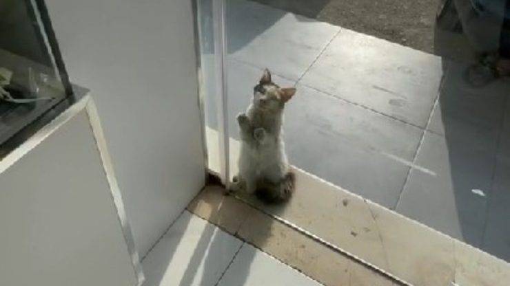 Emergenza ondata di calore, la gattina implora l’uomo di lasciarla entrare nel suo negozio per avere un riparo poiché allo stremo.