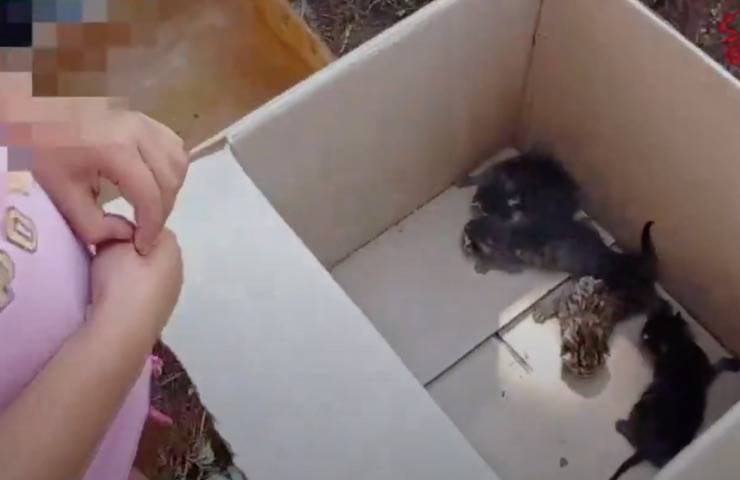 I bellissimi quattro gattini dal manto grigio – dopo essere stati tratti in salvo – sono stati inseriti all’interno di una scatola di cartone aperta posizionata sul terreno. Una visione unica e di estrema dolcezza. Ora verranno – con probabilità – verranno visitati e presi in cura in modo da accertare che le loro condizioni di salute siano ottimali.