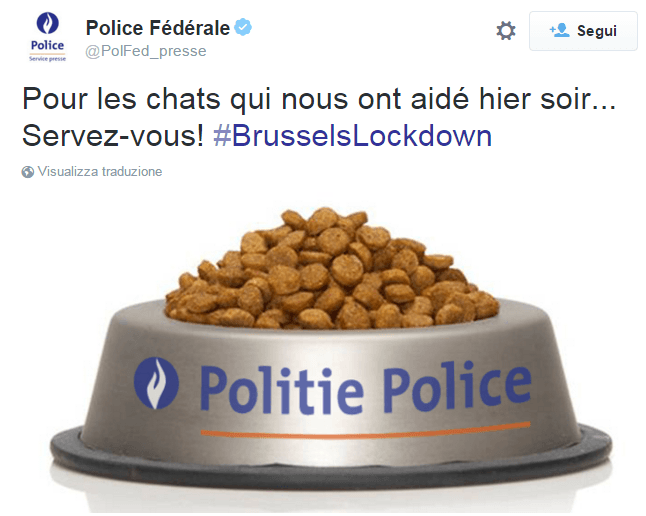 All’insegna dell’hashtag #BrusselsLockdown, nella giornata di ieri, in contemporanea con il blitz delle forze speciali a Bruxelles, vi è stata una pioggia di gattini sul profilo Twitter della polizia belga. Un modo ironico da parte degli utenti che hanno preso d’assalto i social per ironizzare sul coprifuoco che ha regnato nella capitale belga.