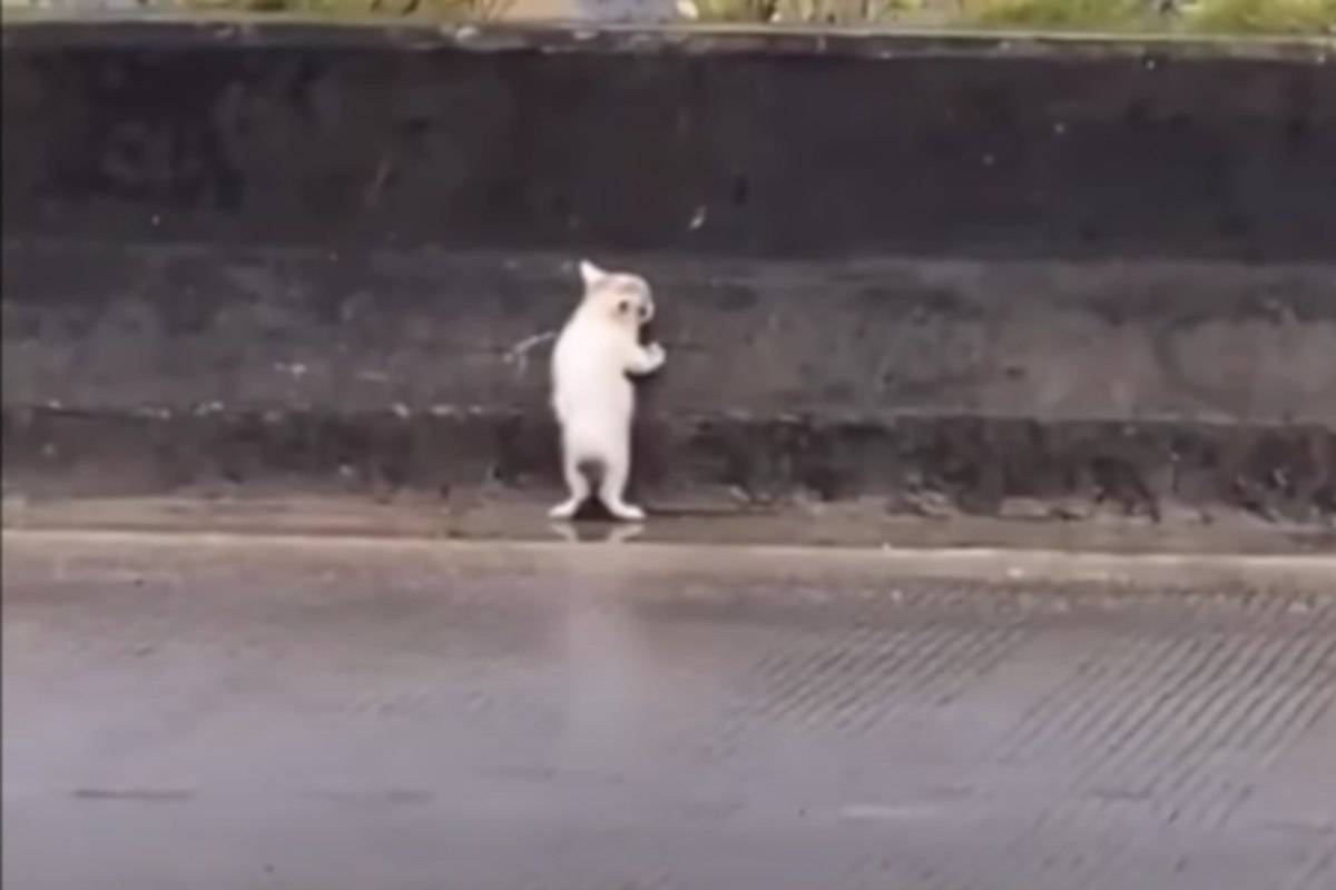 Era talmente terrorizzato dalle auto in corsa che il gattino provava ad aggrapparsi sul bordo della strada e sembrava volesse arrampicarsi, ma senza riuscirci. Inoltre il terrore lo aveva immobilizzato, respirando pure piano. Subito il buon samaritano ha scavalcato lo spartitraffico, attraversato la strada e si è avvicinato al gatto.