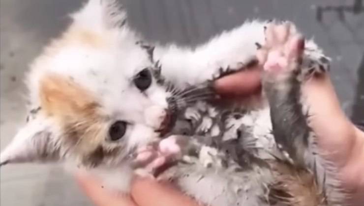Aveva solamente poche settimane di vita, era piccolissimo ed era inzuppato di acqua piovana e sporco di fango. Tra le auto in corsa che lo ignoravano, solo un buon samaritano non ha voltato lo sguardo al gattino ed è corsa ad aiutarlo.