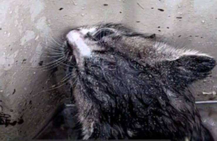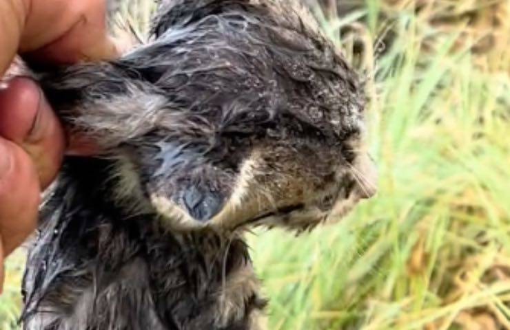 Trova un gattino intrappolato nella pozzanghera: il piccolo micio dopo la tempesta aveva l’acqua fino al collo