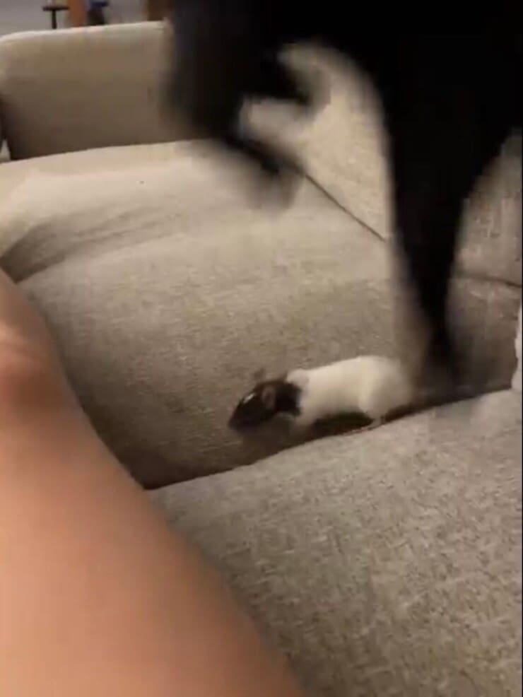 La topolina ha più vantaggio rispetto al gattino, grazie alle sue ridotte dimensioni che le permettono di sgattaiolare più velocemente. Murray viene colto di sorpresa quando si ritrova la topolina sotto di lui, apparsa tra i cuscini, e con un grande salto dimostra tutto lo spavento provato. Ma ancora più voglioso di giocare, si infila anche lui dentro i cuscini cercando di immolare la velocità della compagna di giochi rendendo tutto più interessante.