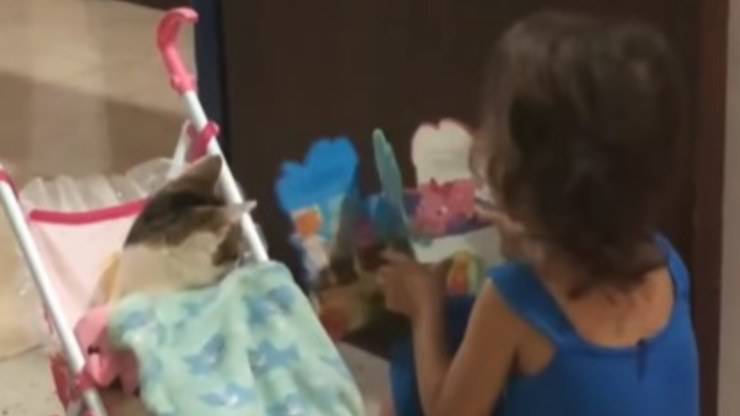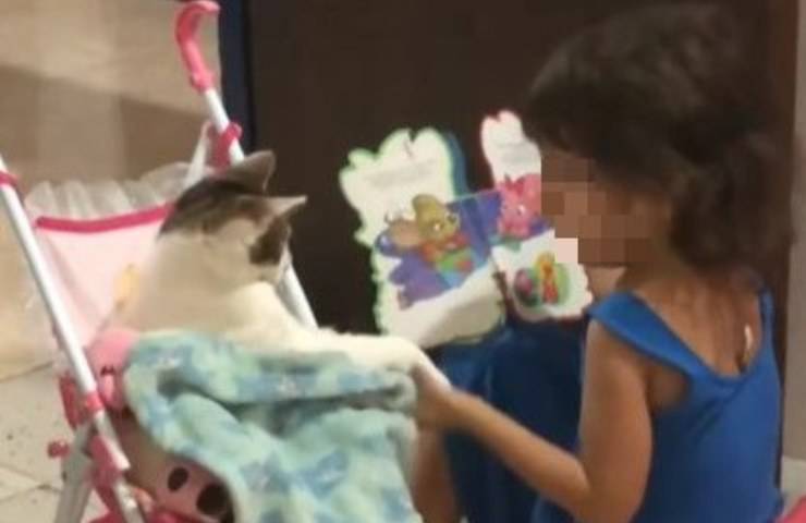Ma ciò che è curioso e virale di questo video pubblicato su Instagram da @cabronazi, non è il fatto che la bambina stia leggendo una storia, bensì la postura del gatto e il luogo in cui si trova: un passeggino delle bambole della bambina. Il gatto sta bello fermo e ascolta attentamente la sua padroncina mentre racconta la storia.