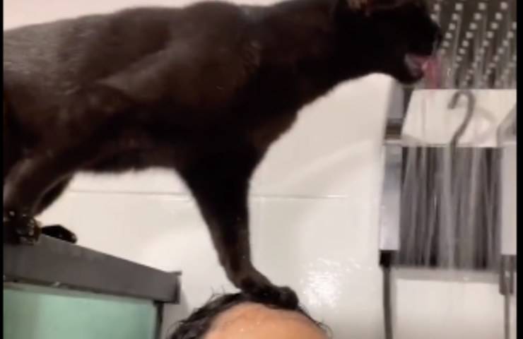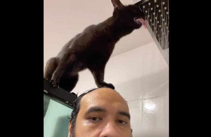 Dal canto suo, per nulla turbato, il micetto ha cercato di avvicinarsi all’acqua che usciva dal microfono; non arrivandoci ha dovuto però ricorrere alla testa dell’umano: il gattino ha infatti poggiato le zampette posteriori sulla fronte dell’uomo come se fosse stata la cosa più naturale possibile, per poi iniziare tranquillamente a bere, prendendosi tutto il tempo di cui aveva bisogno. Il felino ci ha messo così tanto che l’uomo è riuscito a raggiungere il telefonino lasciato accanto alla doccia e a registrare il sorprendete momento. Quest’umano deve essere proprio affezionato al suo quattro zampe per averlo lasciato dissetarsi e per aver usato la sua testa come appoggio. Solo quando il micio ha sentito la mano bagnata dell’umano sulla sua zampa, ha smesso di bere l’acqua e lo ha guardato come se volesse capire per quale motivo fosse stato disturbato. Il video ha divertito milioni di utenti del web; in migliaia hanno commentato che è tipico dei gatti essere senza limiti: «Nothing is off limits for a cat. What’s yours is theirs and what’s theirs is theirs» (tradotto in italiano: «Niente è off limits per un gatto. Ciò che è tuo è loro e ciò che è loro è loro»).