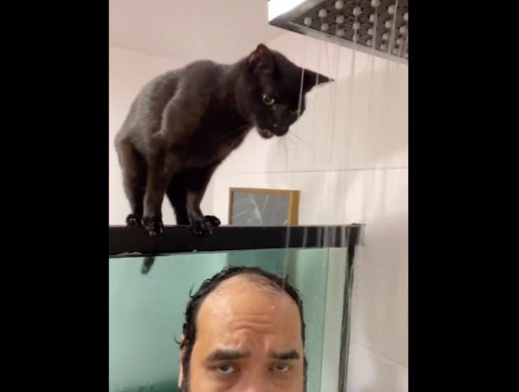 I gatti, come si sa, sono animali molto particolari. In alcuni casi, anche se hanno ciotoline piene di acqua e cibo, tendono a volersi procurare da mangiare e da bere in altri modi. Ad esempio, come è possibile vedere dal video che sta spopolando su Twitter, il gattino dal manto nero si è rifiutato di dissetarsi dalla sua ciotolina riempita di acqua fresca, preferendo l’acqua che usciva dal microfono della doccia. Il problema, però, è stato che il micio ha pensato bene di entrare nel bagno mentre il suo umano si stava facendo la doccia. Arrampicandosi sul vetro della cabina doccia, il felino ha spaventato l’uomo, che mai si sarebbe aspettato di vedere in quel momento il suo quattro zampe.
