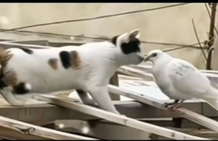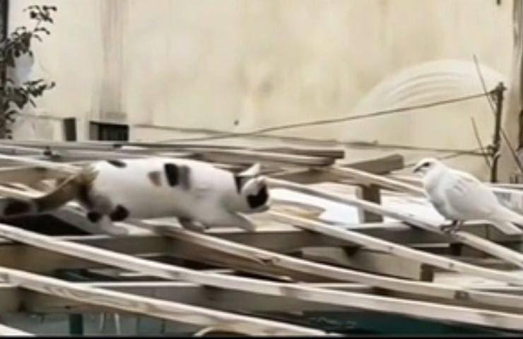 Il breve video, condiviso su TikTok dall’utente @chanterid Chant15, mostra un micetto dal manto bianco con alcune chiazze colorate marroncini e nere sulla coda e sul musetto. Il gattino sta camminando sul tetto di una casa, quando vede davanti a sé un piccione dal piumaggio candido.