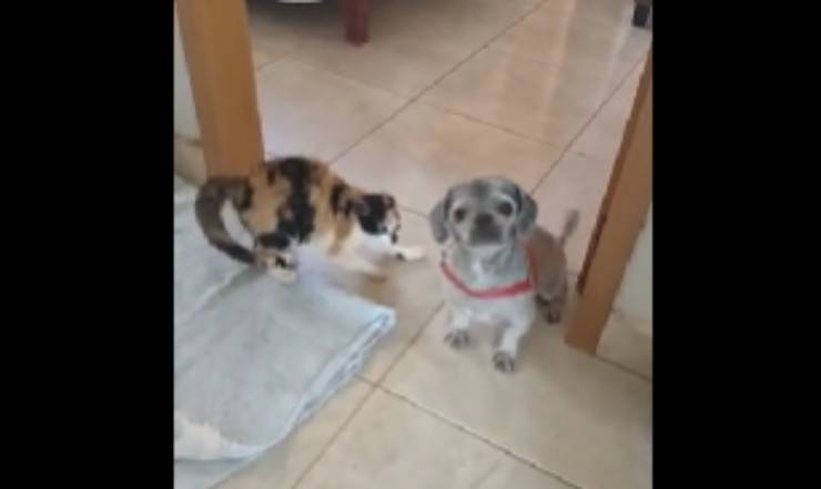 Il gatto è rimasto interdetto quando il cane è tonato a casa dalla toelettatura, infatti è convinto che la mamma abbia sbagliato animale.