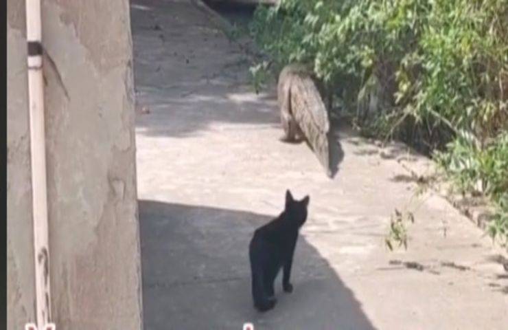 Coccodrillo per i giardini della città, testate tranquilli, ci pensa il gattino a cacciare via l’indesiderato ospite!