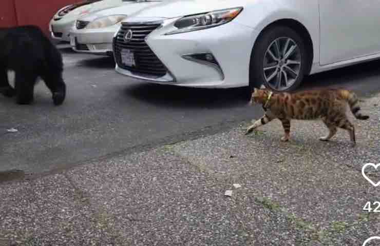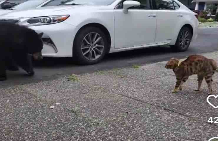 Tiger era nel suo giardino quando ha avvistato un orso nero invadere la sua privacy, i padroni del gatto, Gavin e Cameron Sturrock, hanno dichiarato che erano molto preoccupati quando hanno visto l’orso nel proprio cortile con Tiger a pochi metri da lui. Gavin stava trasportando delle casse per un viaggio in campeggio quando ha avvistato l’orso nero, all’inizio non l’aveva notato ma successivamente si è reso conto di ciò che stava accadendo, il suo gatto e l’orso erano vicinissimi, a quel punto Gavin ha provato a richiamare il suo micio ma non c’è stato niente da fare, il gatto voleva assolutamente far capire all’orso chi comandava.