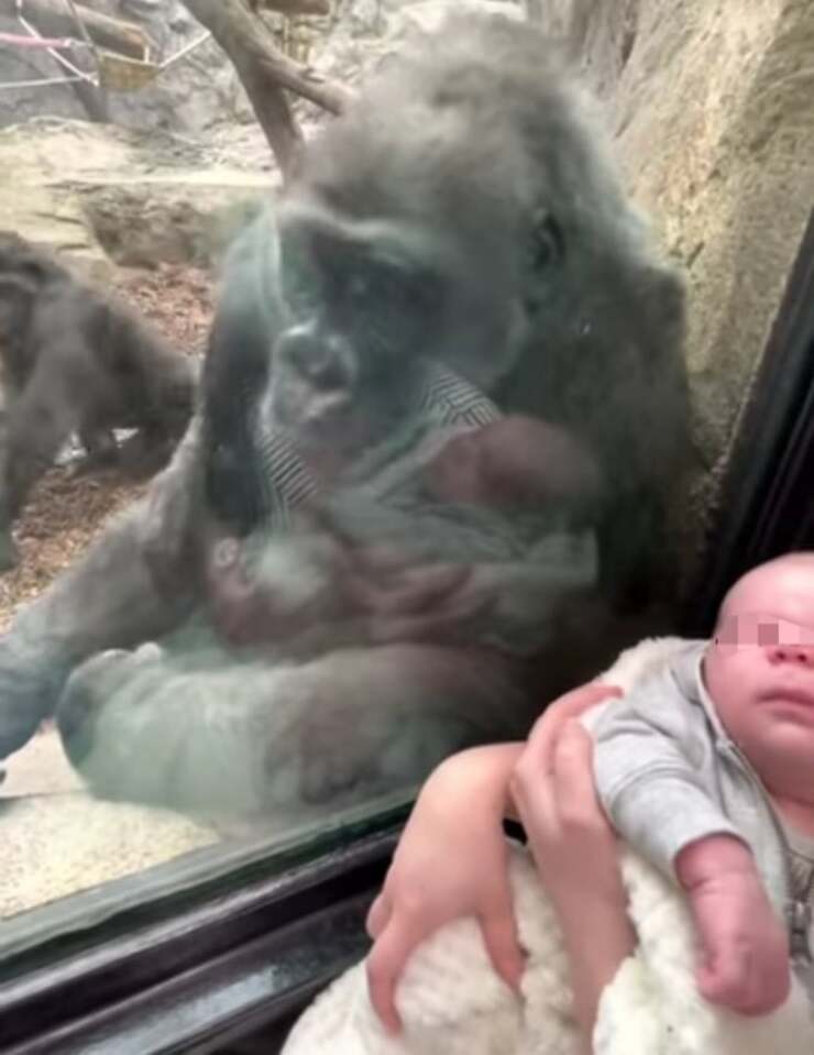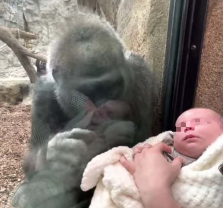 Il gorilla di nome Kiki ha 39 anni e a ottobre è diventata nuovamente mamma, non è quindi estranea alla gioia della maternità e vedendo il piccolo umano attraverso il vetro, è stata rapita dalla sua bellezza e si è avvicinata con fare molto dolce per osservarlo .