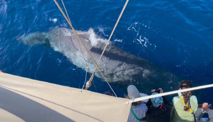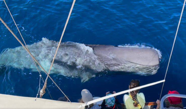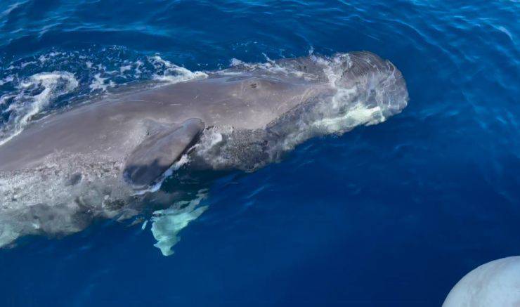 Uno dei maschi si è avvicinato tantissimo alla barca, come si può vedere dalle immagini, per curiosare. Infatti, si è sollevato con un occhio al di fuori dell’acqua più volte per osservare le persone. Si sa, i capodogli sono animali maestosi, ma molto pacifici nei confronti dell’uomo.