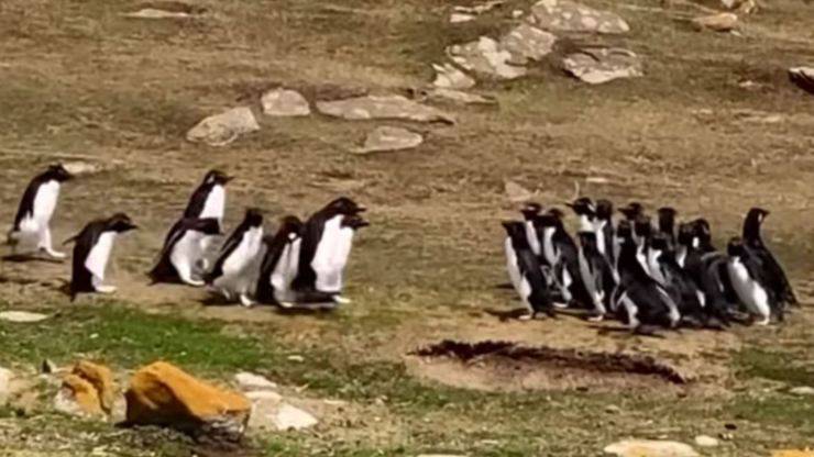 Due folti gruppi di pinguini, uno da destra e l’altro da sinistra, s’incontrano lungo il cammino: un video riprende il fatto esilarante.