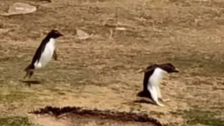 È successo nelle Isole Falkland, quell’arcipelago sperduto nell’Atlantico del Sud. Un video ha ripreso l’incontro fra due gruppi di pinguini. Li si vede avvicinarsi gli con gli altri in modo del tutto amichevole. E così rimane la storia, fino all’ultimo secondo.