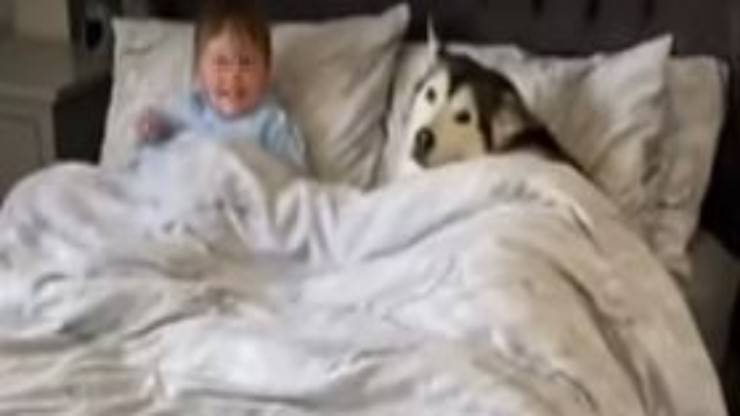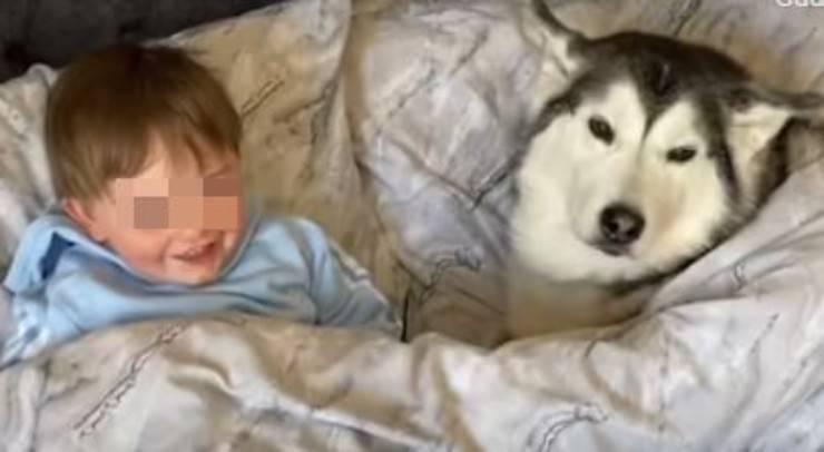 L’Husky coccola il bambino nel letto, una scena piena di dolcezza -VIDEO