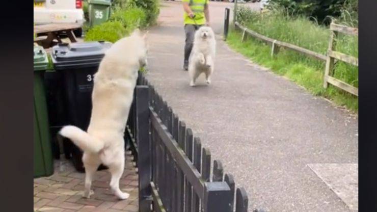 Quando l’amicizia va oltre i cancelli della propria abitazione. L’incontro tra questi due cani è stato davvero sensazionale. Un vide su Tik Tok è diventato virale grazie alle reazioni di un husky siberiano e di un samoiedo che sono diventati grandi amici. Il video è stato postato sulla piattaforma del momento da Sammy, il proprietario dell’husky di 10 anni di nome Hugo. Nella clip si vede Hugo, che incontra il suo nuovo amico, un samoiedo di 7 anni di nome Ice.