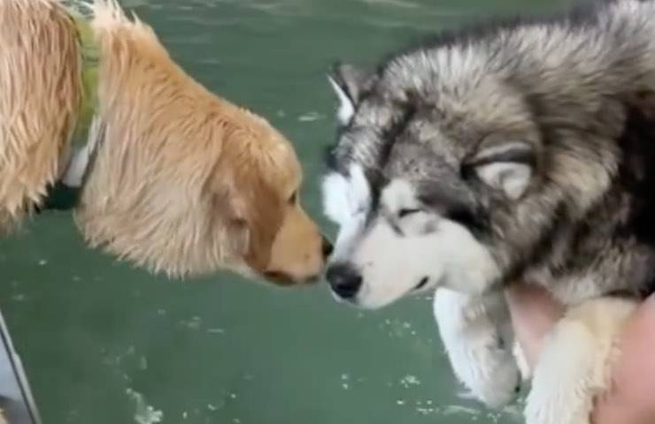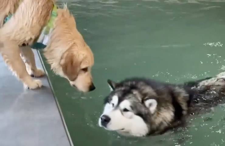 Un Golden Retriever si trasforma in fantastico istruttore insegnando la disciplina del nuoto al fratello: lui è un dolcissimo Husky gigante.
