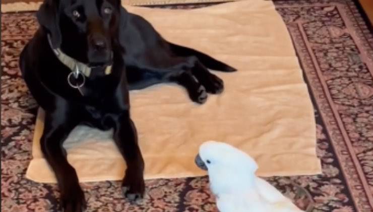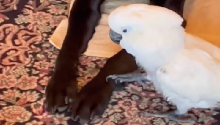Appena 6 giorni fa una clip condivisa dal profilo TikTok @theparrotlady ha emozionato oltre 17mila utenti per la sua straordinaria dolcezza. Il breve filmato mostra l’amorevole gesto di un pappagallo, di nome Sweet Pea, nei confronti del suo migliore amico a quattro zampe, Rame. Dopo aver trascorso il pomeriggio nel parco, giocando con la sua mamma umana, Rame è tornato a casa e si è sdraiato sul bellissimo tappeto dalla texture floreale del loro soggiorno. È stato in quel momento che Sweet Pea si è diretto verso di lui con un unico scopo.