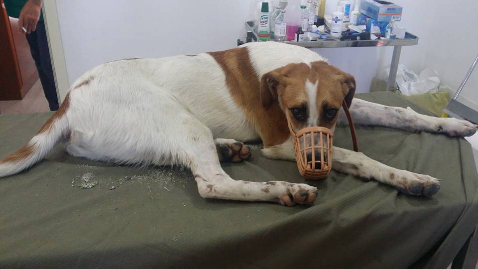 Il cane, un cucciolo di poco più di un anno, è stato trovato strisciante, mentre stava cercando un po’ di quiete lontano dal branco. Un vigliacco che si è avvicinato a quel branco per avvelenare i cani, ha scagliato tutta la sua rabbia, colpendo a bastonate il cucciolo sulla spina dorsale e senza ragione gli ha spaccato la schiena. Il povero cane sofferente cercava di trovare un riparo e strisciava lungo la spiaggia, quando alcuni ragazzi lo hanno trovato e soccorso.