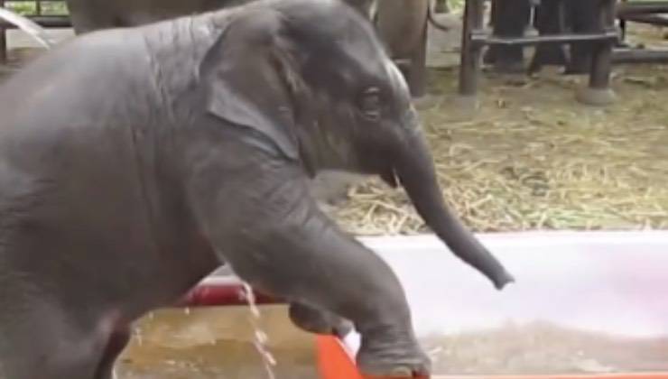 Il primo bagnetto di questo tenero elefantino è di una dolcezza disarmante