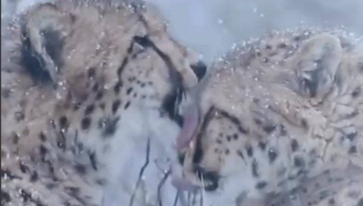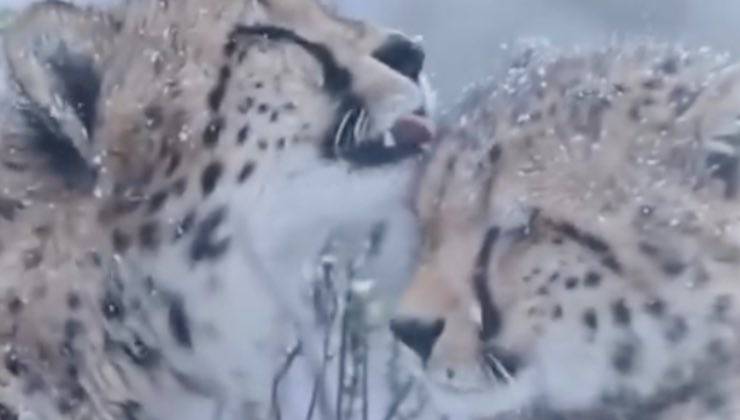 Nel filmato condiviso da @southafrica i due ghepardi adulti vengono sorpresi nell’atto di assaggiare reciprocamente i fiocchi di neve appena posatisi sulla testa dell’altro. Una scena