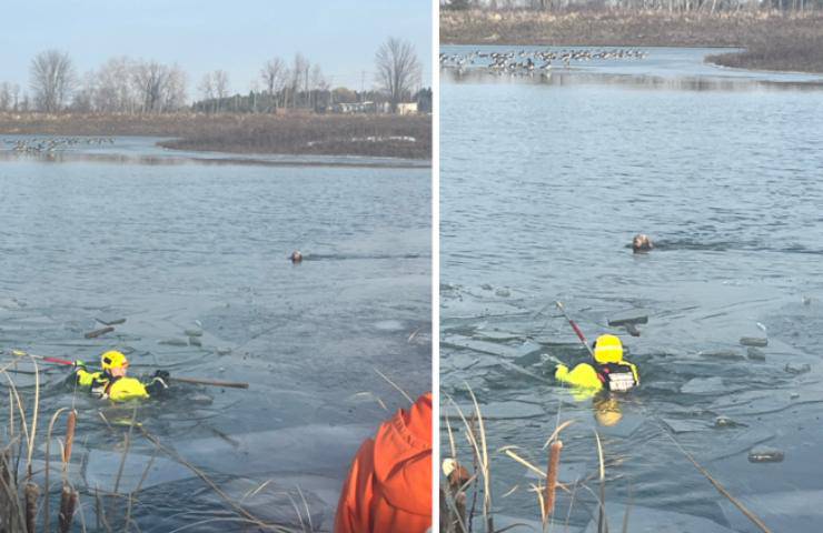 Un uomo stava passeggiando insieme al suo amico a quattro zampe, un cane dal manto marroncino, in prossimità del freddo laghetto. A un certo punto, attirato da uno stormo di oche che volavano vicino, il cagnolino è riuscito a liberarsi dal guinzaglio e ha iniziato a inseguire gli uccelli. La sua corsa, però, si è bruscamente interrotta nel momento in cui è caduto nelle acque gelide del lago. Il suo proprietario è entrato in acqua per cercare di bloccare il cane, ma non è riuscito a salvarlo. Aiutato da un passante, l’uomo è uscito dal lago e ha chiamato i Vigili del Fuoco. Come raccontato dai post e dalle foto pubblicate sul profilo social di Tweet dei pompieri di Ottawa (@Ottawa Fire Services), alle 14:03 di giovedì scorso gli agenti hanno ricevuto la chiamata e in pochi minuti hanno raggiunto l’area di Fernbank Rd e Shea Rd.