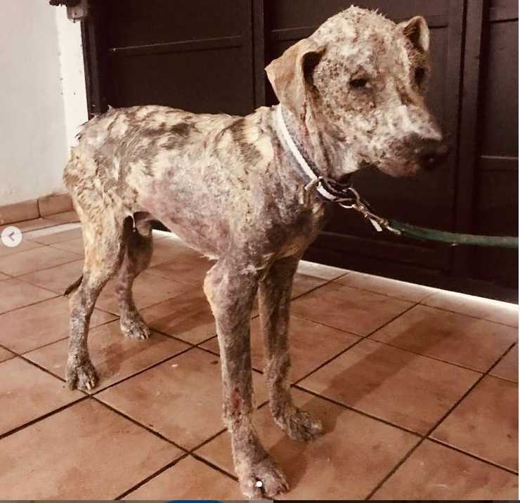La scorsa settimana, il cagnolino è stato riportato al rifugio. Il cane aveva la scabbia, mostrava febbre, sepsi e tremori. Era malnutrito e tutto il suo corpo era ricoperto di croste. Il collare era sporco di fango, e presentava segni che dimostravano di aver trascorso molto tempo legato.