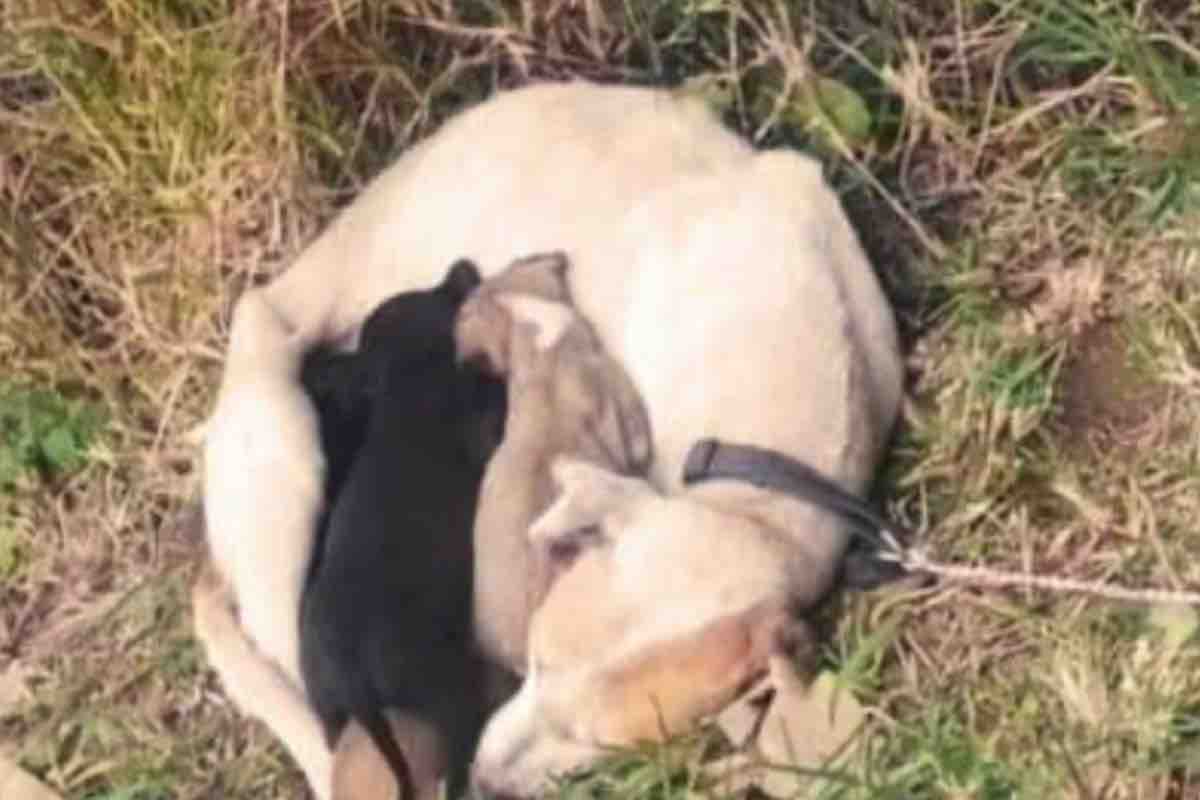Legano mamma cane insieme ai suoi piccoli a pochi metri dal loro cancello: a poca distanza c’è un cartello che rivela il loro passato