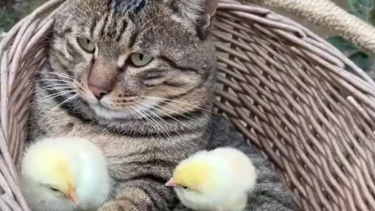 La clip si apre mostrando la gattina mentre se ne sta comoda, mezza addormentata, all’interno di una cestino. Si sa, più i posti sono stretti, fatti di paglia o cartone, e più sono amati dai felini. A tenere compagnia la dolce gattina, ci sono i suoi pulcini appena adottati, che con il suo pelo li tiene bene al caldo. I piccoli animaletti non potevano trovare mamma adottiva migliore, morbida e in grado di tenerli al caldo ora che l’autunno è arrivato.