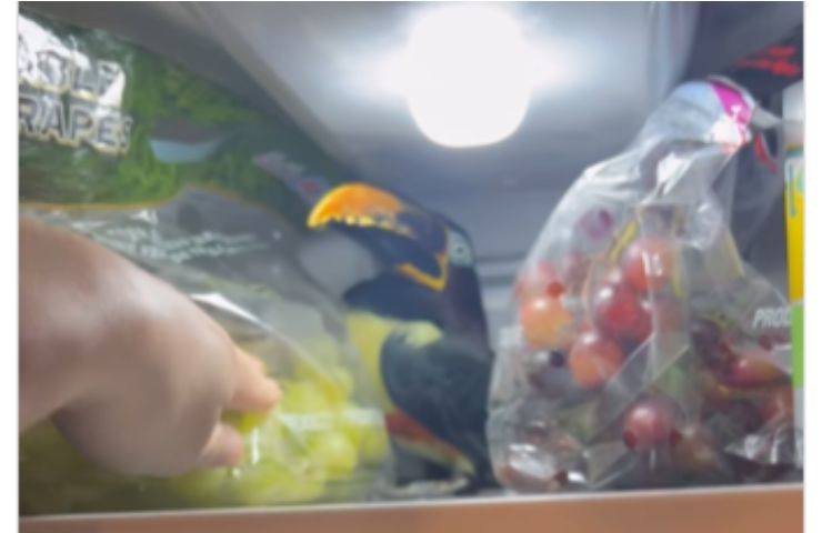Quando la porta del frigo si apre tuttavia non è ben chiaro cosa ci sia tra le bibite e le buste di cibo fresco, poi si riesce a scorgere un becco lungo, quello tipico dei tucani, che prova a ‘scavare’ in una busta di uva. E a nulla valgono le domande della padrona che non riesce quasi a credere ai suoi occhi: pare proprio che Chester non abbia alcuna intenzione di uscire da quel posto.