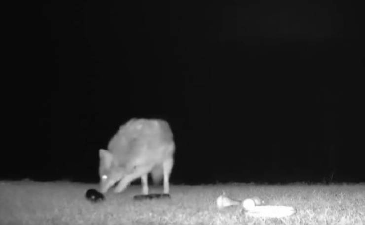 Quando ha ispezionato le registrazioni si è reso conto che un simpatico coyote veniva ogni notte a giocare con i giocattoli del suo Sancho Panza. I cani sono parenti stretti dei lupi e dei coyote e quindi anche se selvatici hanno comunque l’istinto giocoso come i cani domestici.