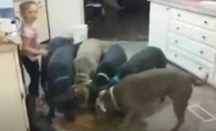 Anche quando la bambina volta le spalle ai pitbull, nessuno dei quattro zampe osa avvicinarsi al cibo. Sanno bene che devono aspettare l’ok della loro padroncina prima di iniziare a mangiare. Infine, la ragazzina conta fino a tre e permette agli animali di mangiare, cosa che non si fanno ripetere due volte due volte.
