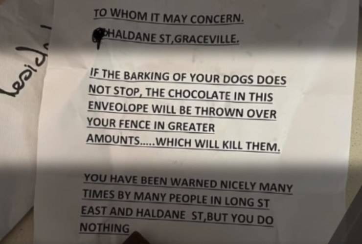 “Se non smettono di abbaiare il cioccolato verrà lanciato in grandi quantità nel vostro giardino e questo ucciderà i vostri cani” questa è la terribile frase scritta nella lettera depositata nella cassetta della posta ed è una frase che sa di vera e propria minaccia.