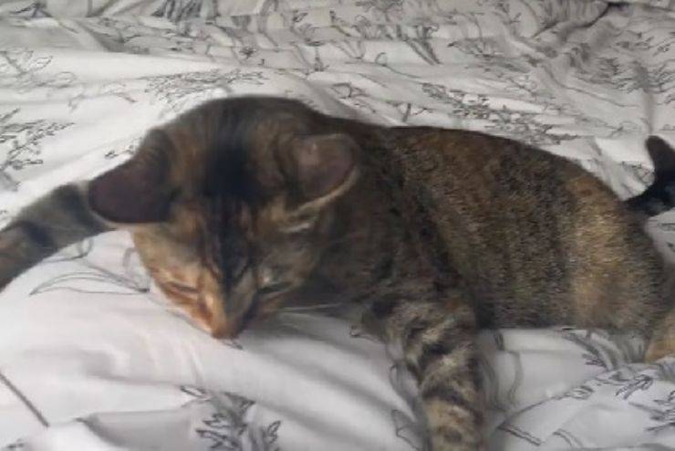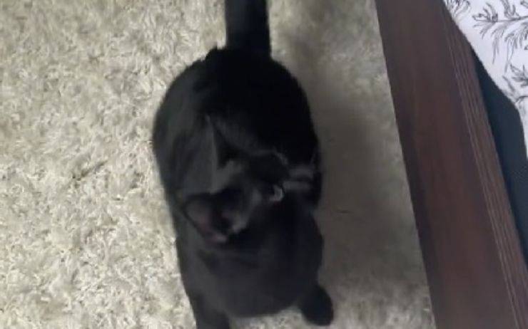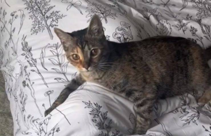 Il padrone prende il telefono per documentare quello che sta accadendo. Il gatto dispettoso, che si chiama Mini, era fermo immobile sul letto e premeva con le zampe sul piumone. Effettivamente al di sotto c’era una piccola protuberanza. Il ragazzo si avvicina e chiede che cosa sta accadendo.