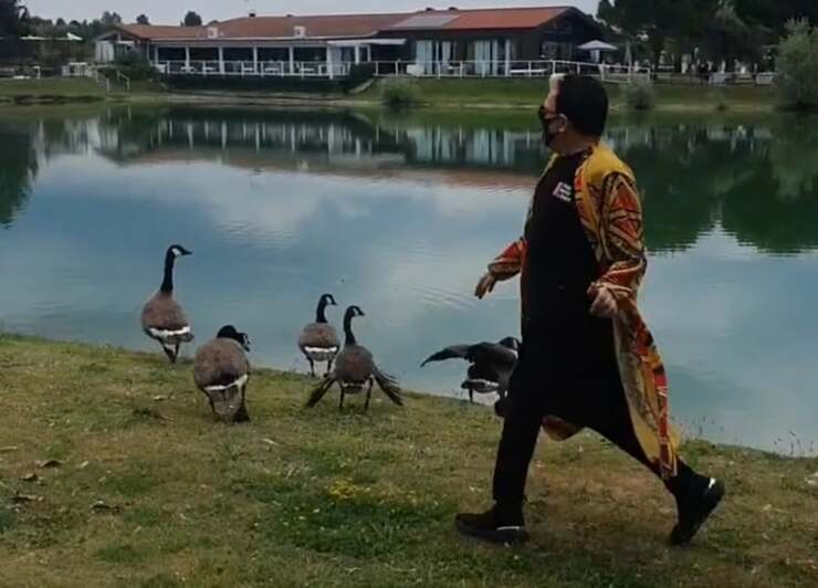 Nonostante le affermazioni dello scorso anno Malgioglio ha deciso di tentare nuovamente un approccio con degli animali simili ovvero con delle Oche Canadesi nei pressi di un laghetto.