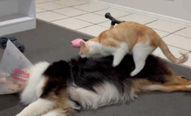 Il suo amico cane, un adorabile Pastore Australiano, stava molto male. La sua salute precaria ha preoccupato tanto il felino che è intervenuto per risolvere immediatamente la situazione, al fine di migliorarla. Il momento del suo supporto è stato registrato in un tenerissimo video che ha fatto il giro del web, dopo essere stato diffuso su Instagram. La scena dura pochi minuti si apre con il cane disteso a terra in stato sofferente che chiede silenziosamente aiuto. Al suo fianco appare un felino che si sdraia su di lui nel tentativo di rianimarlo e farlo riprendere in breve tempo. Il gatto usa tutto il suo impegno per riuscire nella sua impresa ed essere utile al suo amico pelosetto.