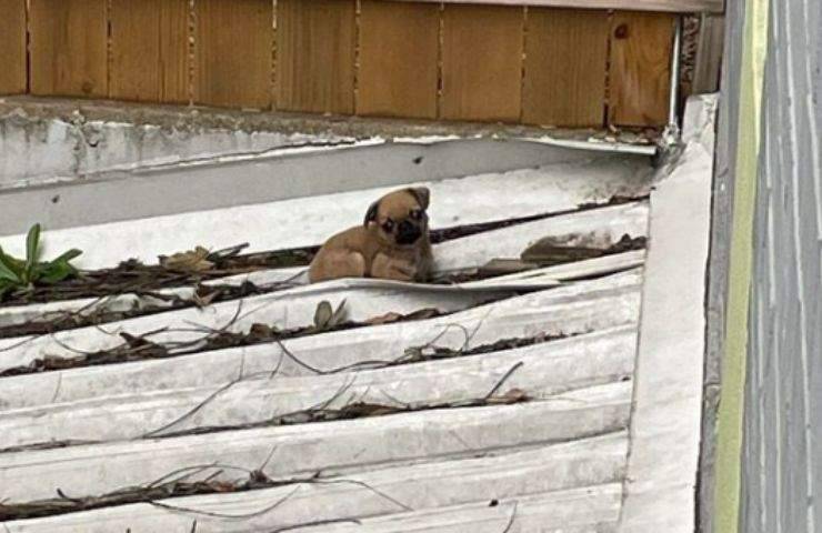 Di certo la prima domanda che mi è balenata in mente è stata: ma come ci sarà finito lassù? E di sicuro non sarò stata l’unica a pensarlo dato che questo piccolo esemplare di Carlino era finito, presumibilmente cadendo, su un tetto di lamiere costeggiato da una ringhiera. E’ possibile che proprio camminando su di essa, il piccolo cagnolino abbia concluso la sua rischiosa ‘passeggiata’ sul tetto.