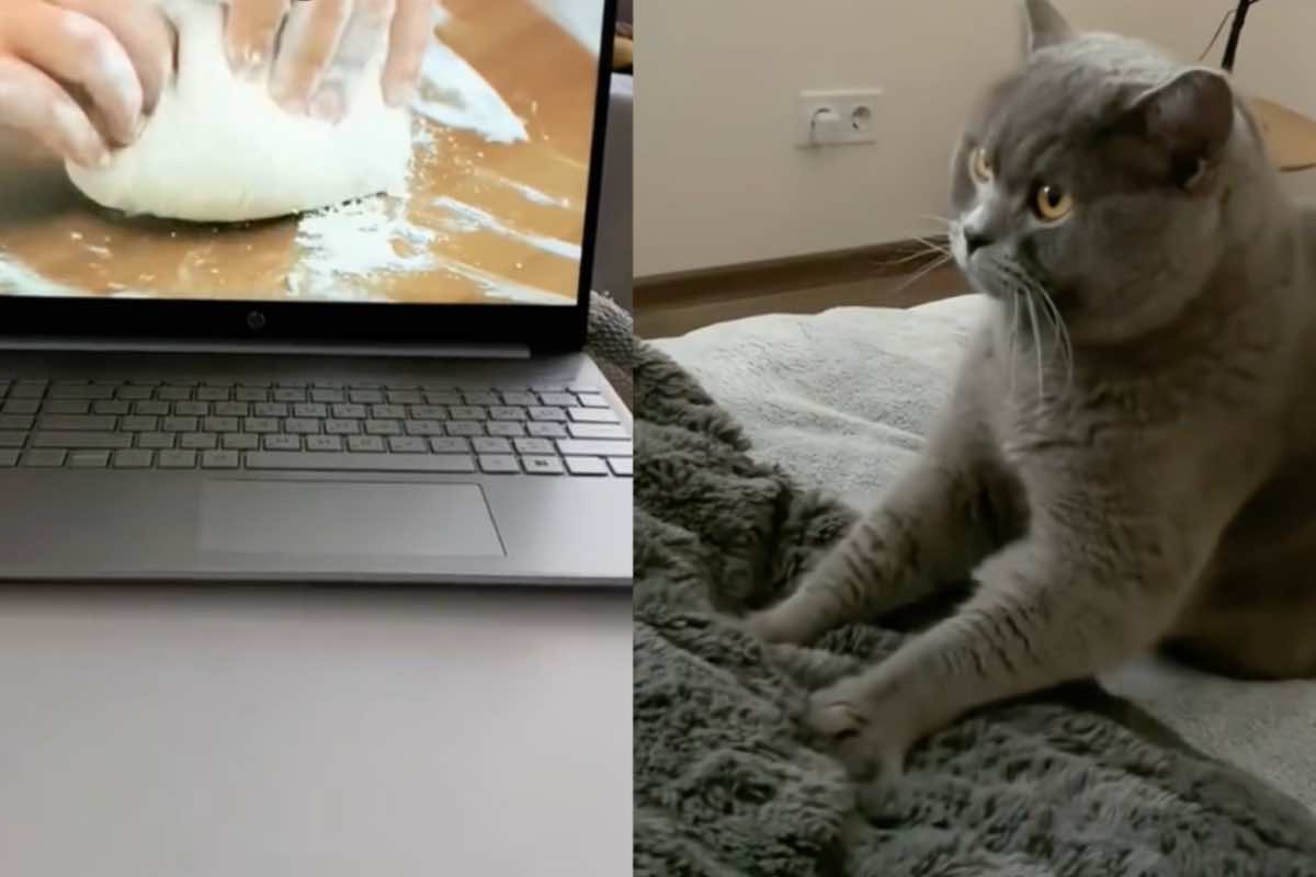 Nella clip dedicata al micio dal pelo folto e grigio si nota come il suo umano di riferimento abbia colto l’esatto momento in cui il gatto è come ipnotizzato dalla trasmissione di cucina. Nello schermo del computer si vede un uomo mentre si dedica a un impasto con della farina su un tipico ripiano da stesura.