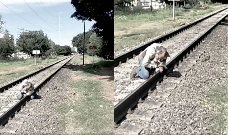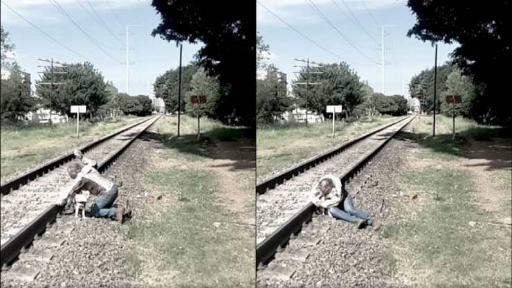 La situazione era disperata e il tempo a disposizione per mettere al sicuro il cucciolo stava per esaurirsi. L’uomo aveva percepito le vibrazioni che annunciavano l’arrivo del treno: il pericolo era ormai in agguato.