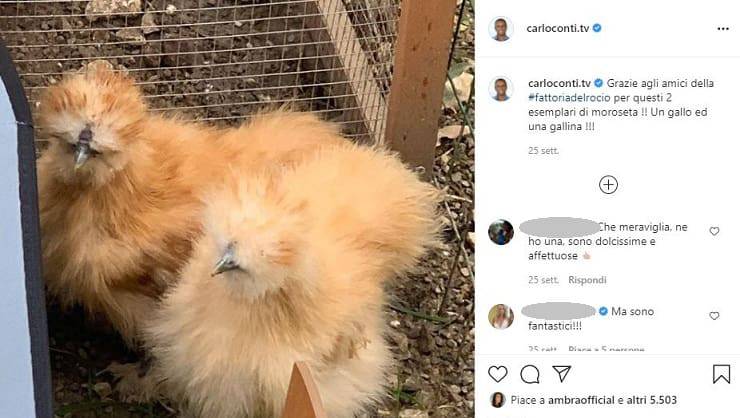 Il conduttore e sua moglie Francesca Vaccaro qualche mese fa avevano adottato altri due “insoliti” animali domestici. Nel post che vedete qui sopra il presentatore aveva dato il benvenuto a due esemplari di Moroseta, una particolare razza di galline dall’aspetto insolito e un piumaggio che somiglia al pelo di un gatto.