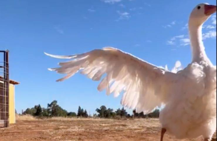 Il filmato in cui l’oca Harriet scorrazza velocemente e in modo teatrale, come se fosse un mobile spaventapasseri, facendosi largo nel terreno di famiglia è prova della rassicurazione che sarebbe in grado di fornire agli altri esemplari proteggendo gli orti della fattoria tra un tuffo in acqua e l’altro.