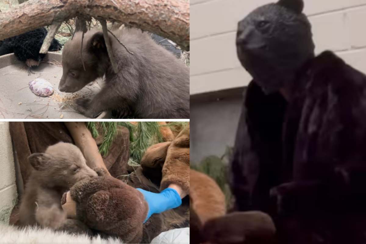 Travestiti da mamma orso, operatori del centro di recupero si prendono cura del cucciolo orfano