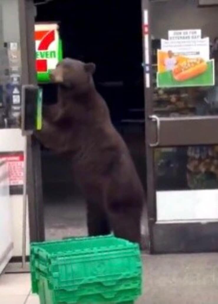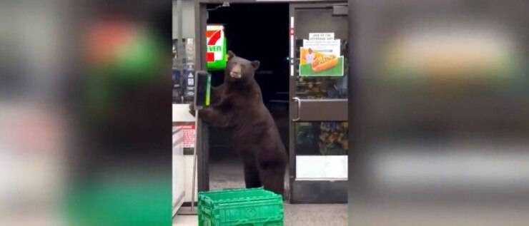 Sempre più orsi si avvicinano senza alcuna paura o timore agli esseri umani. Così può capitare che sei tranquillo a lavorare in un negozio, quando davanti alla porta d’entrata si palese un gigante orso bruno.