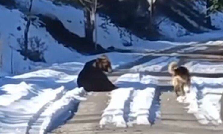 Juan Carrito si trovava sul sentiero di un piccolo Borgo di Villalago, quando un cucciolo, a spasso con la sua amica umana, lo ha avvicinato. Il cane senza museruola e non al guinzaglio, gira intorno all’orso abbaiando nella sua direzione. Da parte sua l’orso ha proprio voglia di giocare, sdraiandosi a terra, provando a rotolare e cerca anche di coinvolgere il quattro zampe che però resta sulle sue.