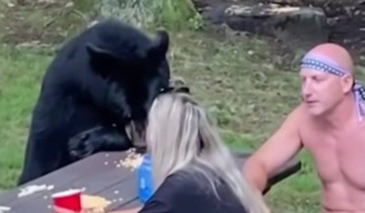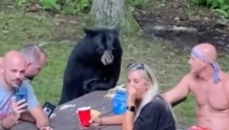 Un orso selvatico è stato l’ospite inaspettato di un gruppo di persone impegnate in un picnic, ecco come si è unito al pranzo.