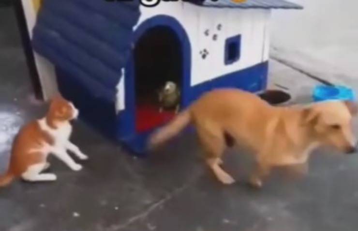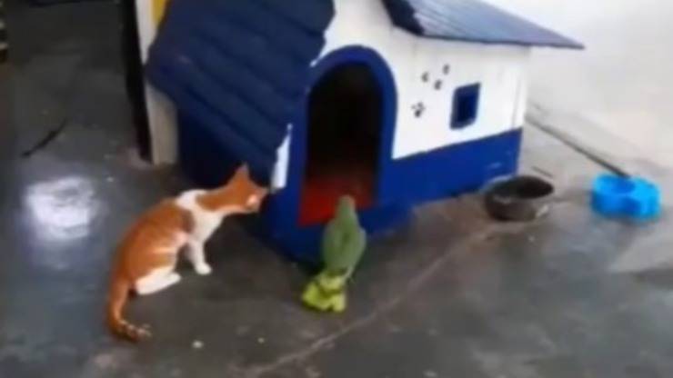Il cane possiede una casetta pensata apposta per lui, tuttavia si vede costretto a lasciarla. Nel video si vede infatti, che dopo un po’ il pappagallo si avvicina alla casetta del cane, entra e “spaventa” l’animale mettendosi a gridare, facendo si che se ne vada dalla casetta. Nel mentre, il gatto sembra sorpreso quando vede il suo amico peloso scappare. Soddisfatto della marachella appena compiuta, il pappagallo si mette anche a ridere in modo molto forte ed esilarante.