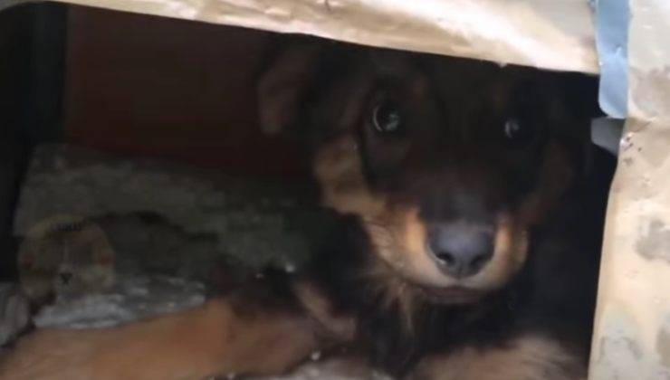 Il cucciolo considerava quella scatola come il suo posto sicuro ormai e il volontario ha trovato lì il cane. Però, come si aspettava, il piccolo era molto spaventato e quando lo ha visto si è ritirato ancora di più. Non solo, ma il cagnolino ha iniziato a piangere disperatamente.