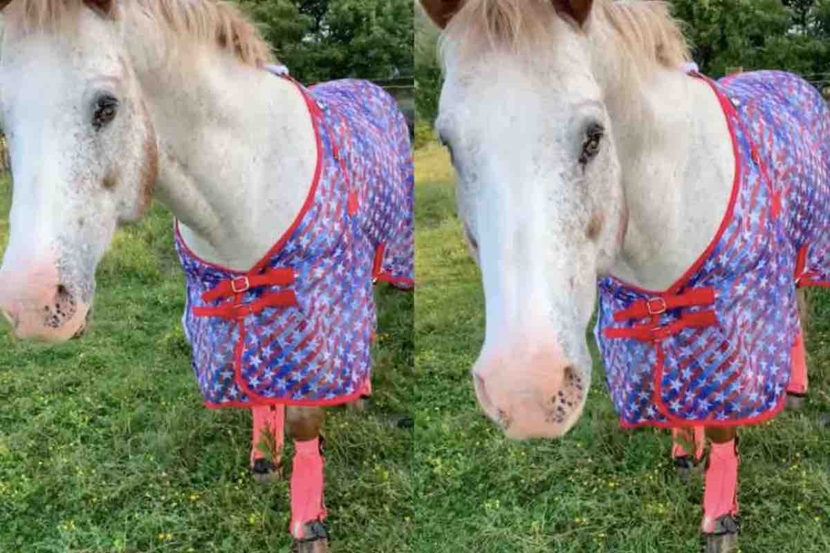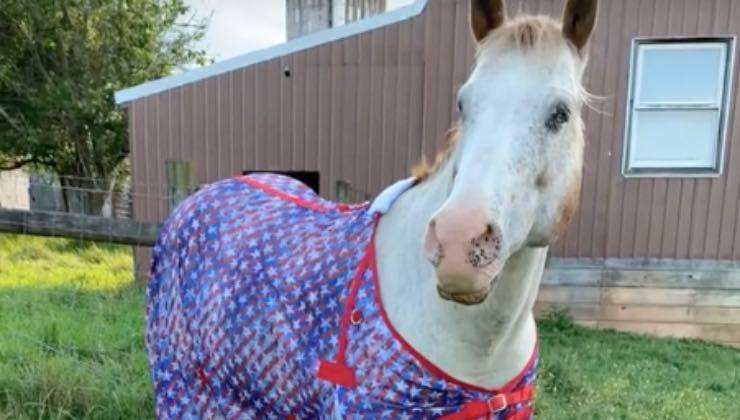 Per festeggiare il ritrovamento del cavallo non vedente – dopo giorni di ricerche – la mamma umana di Buddy ha deciso di far indossare a Buddy il suo vestito preferito. Un mantello colorato, con la texture a stelline e bordato da rifiniture rosse, è decisamente il capo che più dona al sensibile Buddy. Il fantastico mantello sembra inoltre che aiuti i frequentatori del rifugio a rendere Buddy maggiormente visibile. Un’accortezza utile soprattutto a coloro che potrebbero incontrarlo nuovamente, per caso, sul loro cammino.